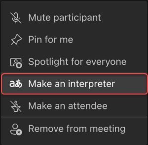 - Si cuentas con invitados externos que quieres designar como intérpretes durante la reunión, selecciona “Participantes”. Una vez seleccionada la persona que ha sido escogida para ser intérprete, selecciona “Convertir en intérprete” dentro de “Más opciones”.